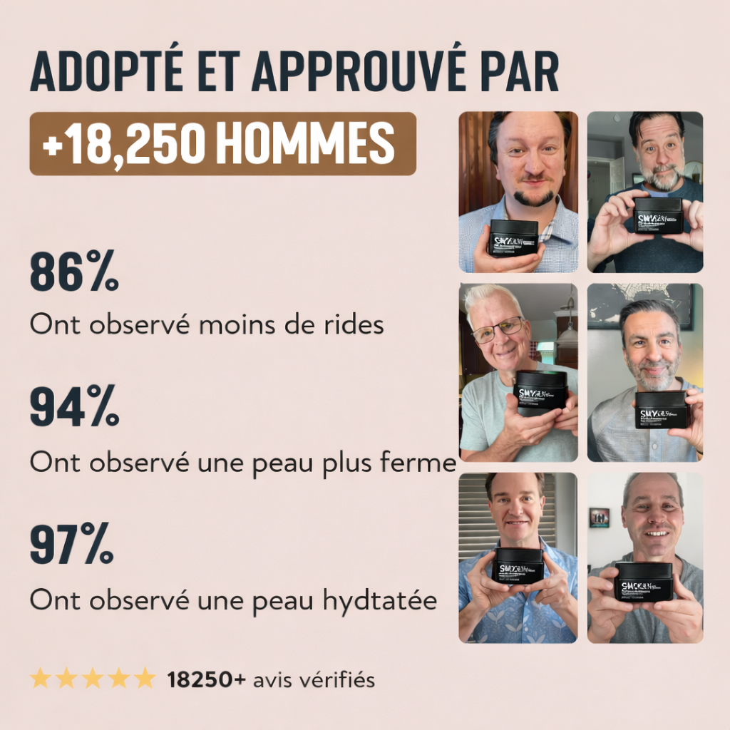 La plupart des hommes constatent une différence dès la première application : la peau est immédiatement plus ferme et hydratée. Une amélioration visible des rides apparaît généralement sous 7 à 10 jours. Les changements les plus significatifs se produisent après 2 à 3 semaines d’utilisation régulière. Les rides plus profondes continuent de s’atténuer pendant 4 à 6 semaines.