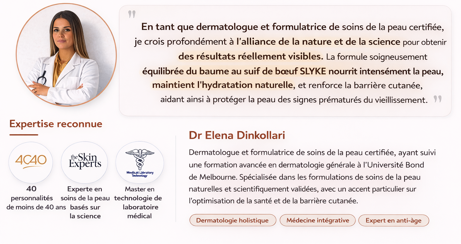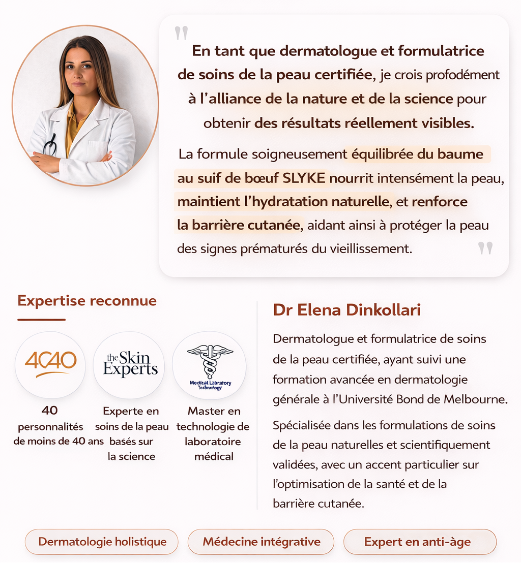 Le principe est simple : le suif de bœuf possède une structure moléculaire quasi identique à celle des huiles naturelles de votre peau. Ainsi, votre peau le reconnaît comme un aliment et non comme une substance étrangère. Ce baume apporte des acides gras essentiels et des nutriments en profondeur dans les couches cutanées, favorisant la production de collagène et renforçant la structure de la peau. Il agit en apportant à votre peau exactement ce qu’elle a perdu au fil du temps.